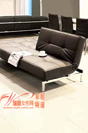 黑色皮質(zhì)面料和寬大體型為此款沙發(fā)床帶來(lái)從容大氣的感覺(jué),銀色鋼架底座和同材質(zhì)的低姿茶幾相映生輝,在床底加裝曲木板條和彈簧,使其保證人體長(cháng)期的躺臥而不變形。