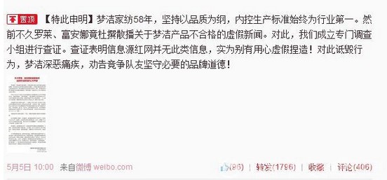 2014-5-6夢(mèng)潔家紡昨日在北京召開(kāi)媒體溝通會(huì ),要求家紡業(yè)另外兩大巨頭羅萊家紡和富安娜就其制造“假新聞”詆毀夢(mèng)潔家紡道歉,并同步在夢(mèng)潔家紡官方微博上發(fā)布聲明。夢(mèng)潔家紡要求,羅萊家紡和富安娜自即日起七天內在各自的官方微信平臺,以及各自所屬微信公眾平臺“羅萊家紡平臺、溫嶺羅萊家紡、天津羅萊家紡、常寧富安娜”上公開(kāi)道歉...[繼續閱讀] -